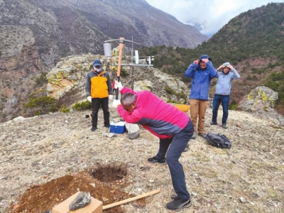“大家開玩笑說,第一天基本上是搞基建。”樊晉表示,要架設自動氣象站得先挖地基,“得把搭建儀器用的水泥、砂石搬運到架設點,有些基坑表層土壤下面巖石還比較多。剛開始缺乏經驗,我們用木棒扛水泥袋,結果太重把木棒撐斷了,最后換上鋼管才解決問題。挖好基坑后,還要等水泥凝固后,第二天再上山架設儀器。”