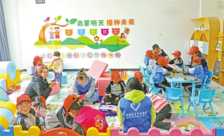圖為志愿者陪伴瓊結縣加麻鄉昌嘎村兒童在該村日間照料中心婦幼兒童功能區玩耍。劉楓 本報通訊員 熊起樊 攝