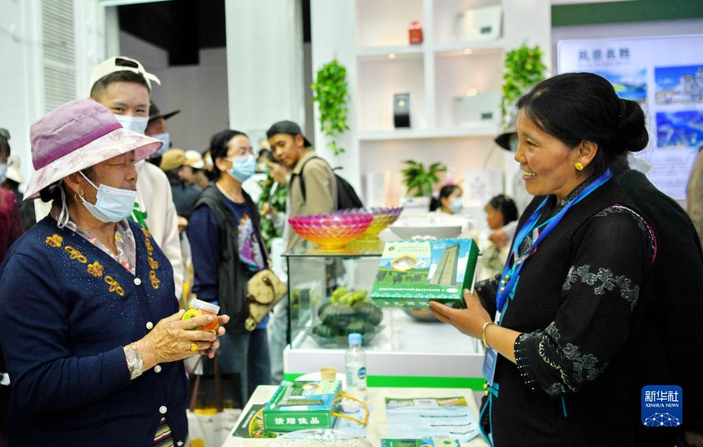 在藏博會上,來自西藏昌都市的參展商(左)向顧客推介產品(6月17日攝)。新華社記者 張汝鋒 攝