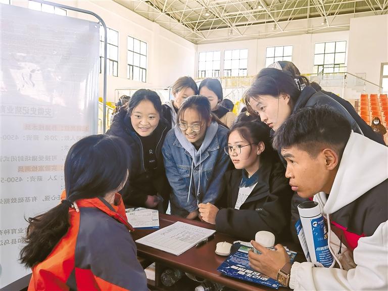 4月3日,在西藏職業技術學院文學院舉辦的旅游酒店行業招聘會上,20多家星級酒店到現場招攬人才。這是學校今年春季開學以來舉行的第19場招聘會。
