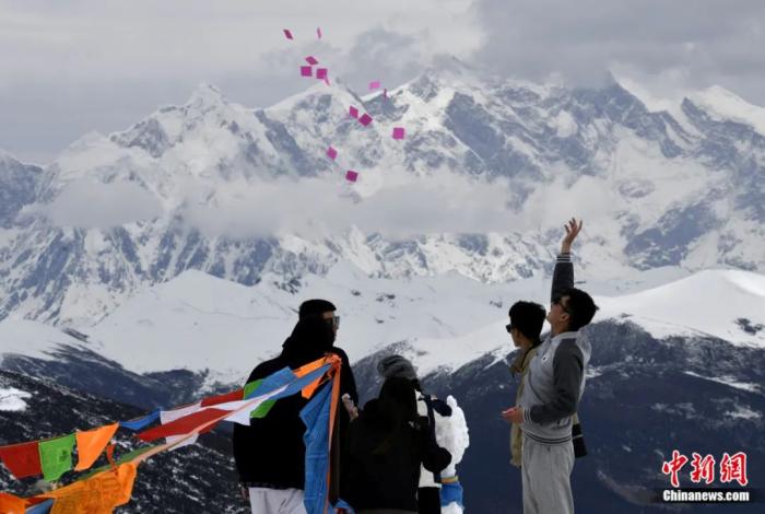游客在西藏林芝色季拉山觀景臺拋灑“隆達”(風馬旗,藏族民眾的一種祈福方式)。李林 攝