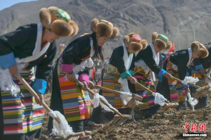 2021年3月16日,藏歷鐵牛年二月初三,西藏自治區拉薩市堆龍德慶區德慶村的上百位村民身著盛裝舉行傳統春耕儀式。貢嘎來松 攝