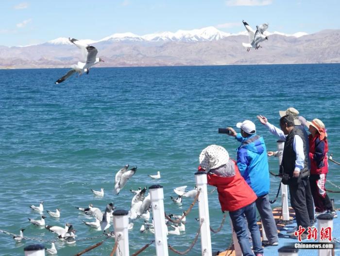 游客在班公湖邊拍攝棕頭鷗。班公湖位于西藏自治區阿里地區日土縣西北部,平均海拔4242米。這里景色優美,水草豐茂,有眾多鳥類棲居于此。冉文娟 攝