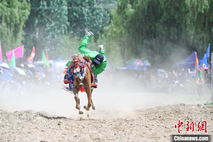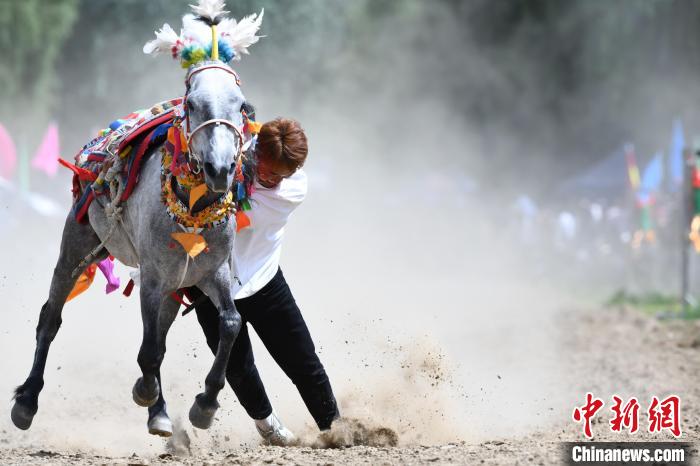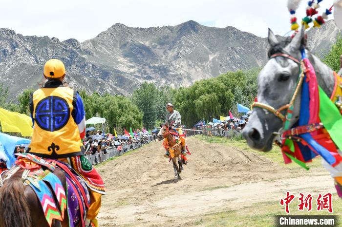 7月24日,在西藏自治區(qū)拉薩市曲水縣曲水鎮(zhèn)茶巴朗村村民身著節(jié)日盛裝進行賽馬和馬術表演歡度“望果節(jié)”。“望果節(jié)”已有1500多年的歷史,是國家級非物質文化遺產,流行于西藏拉薩、日喀則、山南等地。