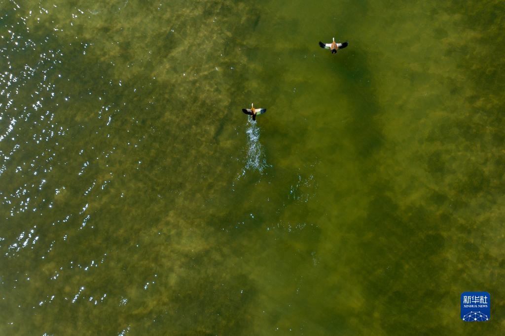 飛鳥從打加錯湖面掠過(無人機照片,8月30日攝)。新華社發(旦增努布 攝)