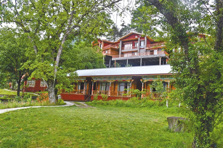 仁青客棧位于離波密縣城10公里處的古鄉(xiāng)巴卡村。穿過(guò)江上的石橋,走進(jìn)客棧簡(jiǎn)樸的大門,一棟棟樣式別致的建筑矗立于山坡之上,院中鮮花盛開(kāi),綠草茵茵。沿著臺(tái)階拾級(jí)而上,遠(yuǎn)處秀美的風(fēng)光一目了然。