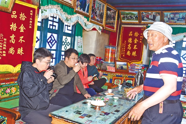平措在家庭旅館內(nèi)招待北京來(lái)的游客。張猛 攝