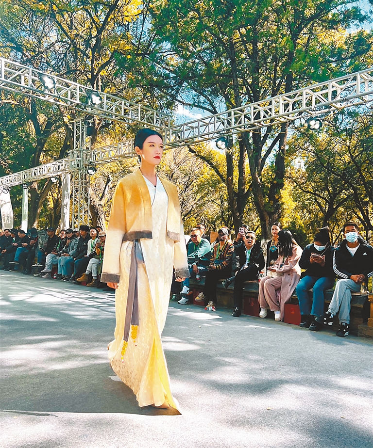 來自杭州的模特王添玉給記者介紹了他展示的“星落”系列,該系列在傳統日喀則服飾的基礎上增添了許多時尚元素,色彩、廓形、材質和制作工藝方面都有創新,更受當下年輕人青睞。