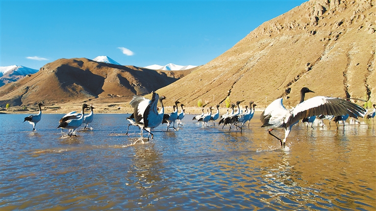 近年來,西藏不斷加大黑頸鶴生存環境保護力度,黑頸鶴數量呈現逐年遞增的良好態勢。10月21日,記者從林周縣了解到,黑頸鶴“先遣隊”已抵達林周縣,開啟越冬模式。首批到達林周的黑頸鶴共有58只,主要棲息在虎頭山水庫和卡孜水庫。