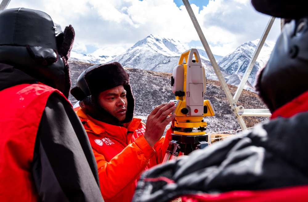 索縣榮布至丁青縣巴達35千伏線路工程負責人黃小洪在現場開展線路弧測量教學。(趙清鵬 攝)