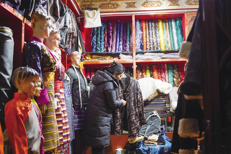 “最近來做冬款藏裝的人挺多的,大部分都是本地居民。”店主吉宗介紹,中老年人常穿的款式是無袖深色和單色的“特瑪”料子藏裝,年輕人則喜愛傳統和潮流兼備的藏裝。同時,隨著旅游業的發展和各民族文化交流加深,很多游客也開始購買藏裝,“以前游客都是春夏買藏裝,但是現在也有一些游客會買冬裝。”吉宗說,大多數游客一開始普遍喜愛花色眾多、顏色亮麗的綢緞料子,慢慢會比較偏向純色、傳統藏裝。
