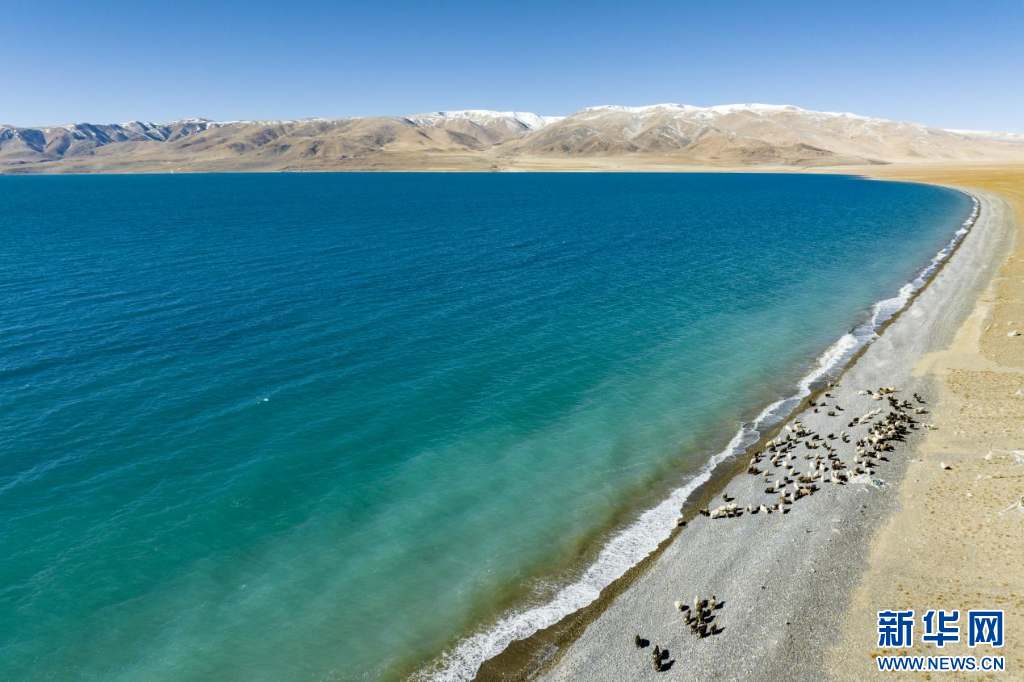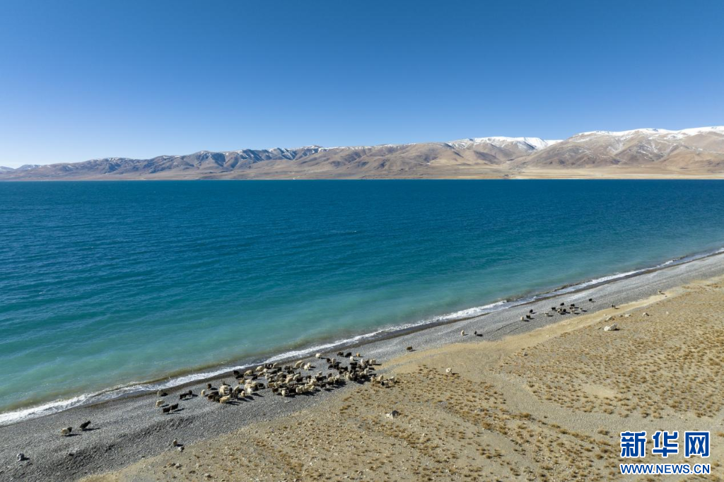 12月20日拍攝的當(dāng)惹雍錯(cuò)湖畔的羊群(無(wú)人機(jī)照片)。新華網(wǎng) 旦增努布 攝