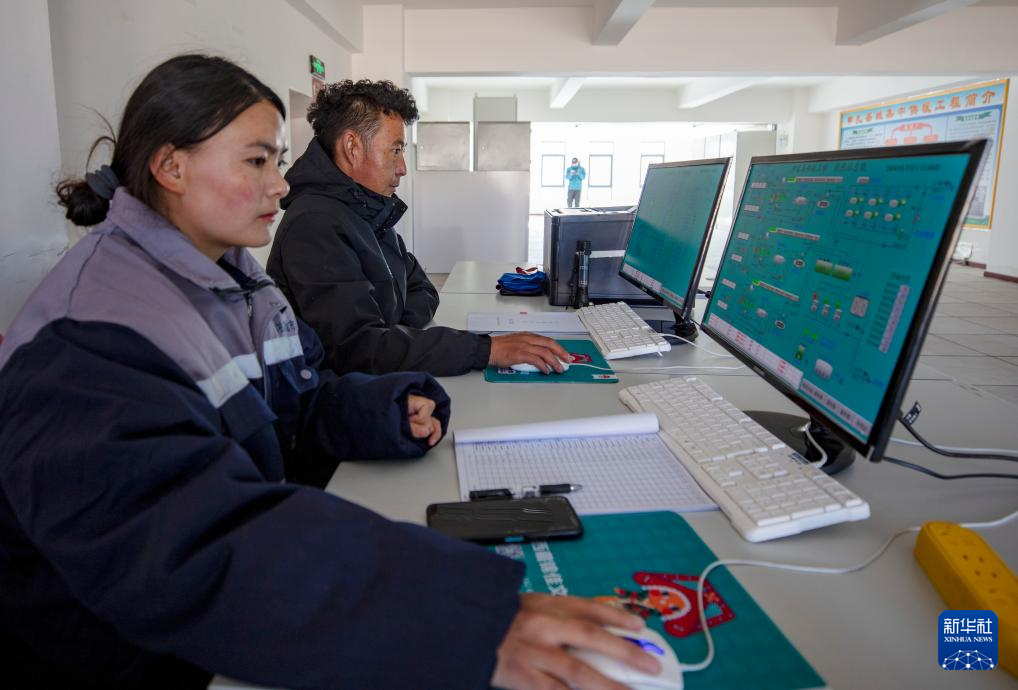 供暖工程的運維管理方申扎凈地市政管理有限公司經理楊參奎(后)和同事在管理系統上監控供暖系統運行(1月6日攝)。新華社記者 姜帆 攝