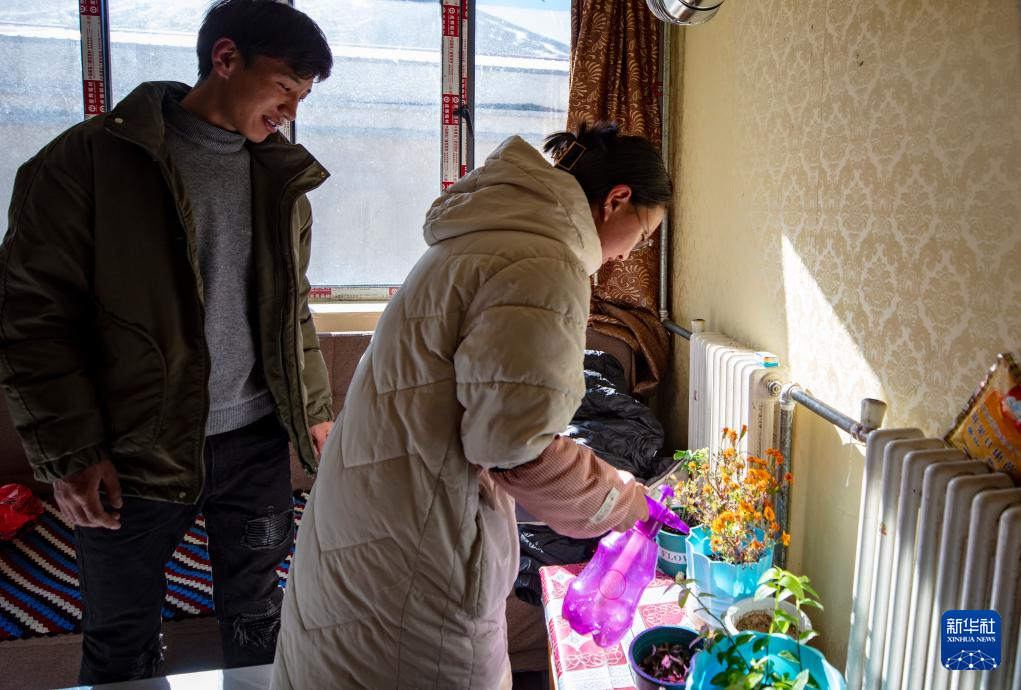 距離太陽能集熱場約3公里外的縣職工周轉房小區是供暖工程的最遠端,年輕夫妻曲珠(左)和央次仁在家中侍弄花草(1月6日攝)。新華社記者 姜帆 攝