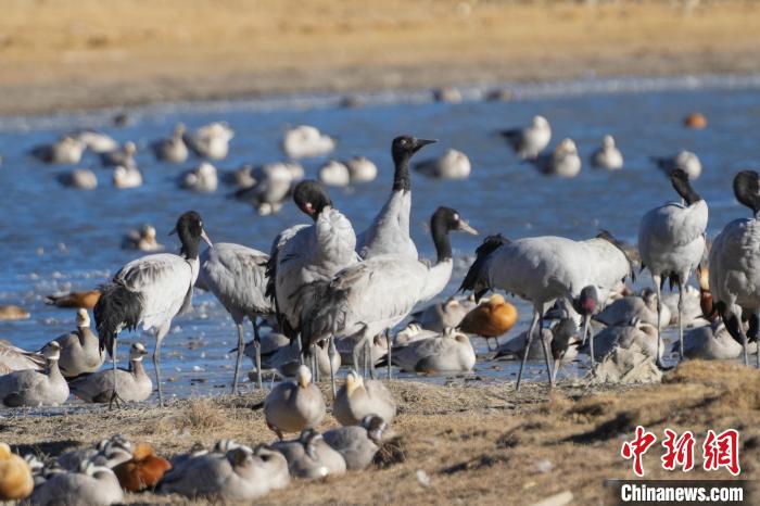 1月10日,西藏雅魯藏布江中游河谷黑頸鶴國家級自然保護區(qū)日喀則片區(qū)拉孜縣曲瑪鄉(xiāng)境內(nèi),大量越冬的黑頸鶴翩翩起舞,在濕地和農(nóng)田間覓食、嬉戲。近年來,隨著國家加大青藏高原生態(tài)保護力度,西藏多措并舉實施生態(tài)建設(shè),廣大農(nóng)牧民民眾保護野生動物的意識不斷提升,黑頸鶴及其棲息地得到了較好的保護,黑頸鶴數(shù)量逐年遞增。據(jù)悉,每年11月至次年3月,日喀則市拉孜縣、謝通門縣、桑珠孜區(qū)等地都會有黑頸鶴在此棲息過冬,最高數(shù)量達到8000只左右。