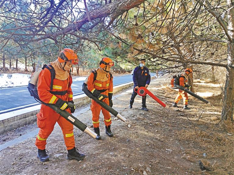 圖為森林消防員們在巴河鎮周邊開展林下可燃物清理工作。記者 張猛 攝