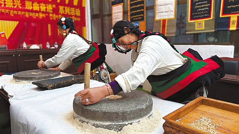 圖為在第三屆“鄉村振興 那曲奮進”農牧民技能大賽中,巴青縣農牧民參賽選手進行手工磨糌粑。記者 萬靖 攝