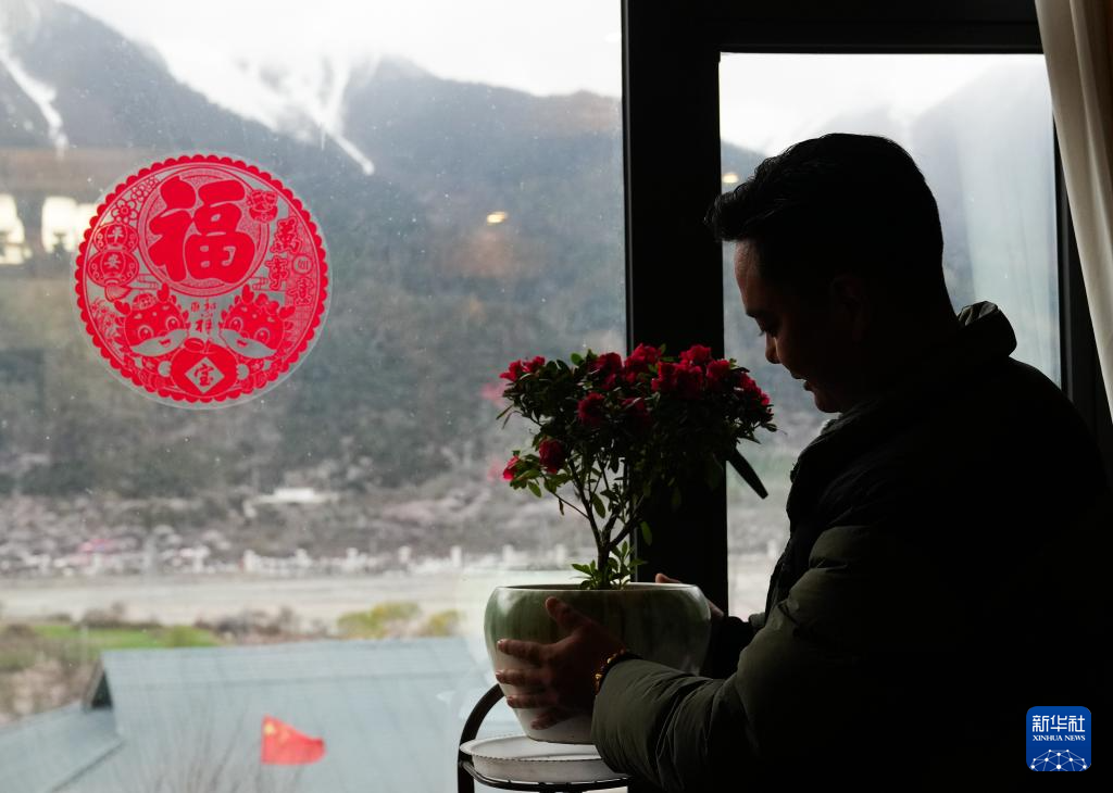 4月2日,洛松頓珠在自家民宿的客廳內(nèi)整理盆栽。新華社記者 丁汀 攝