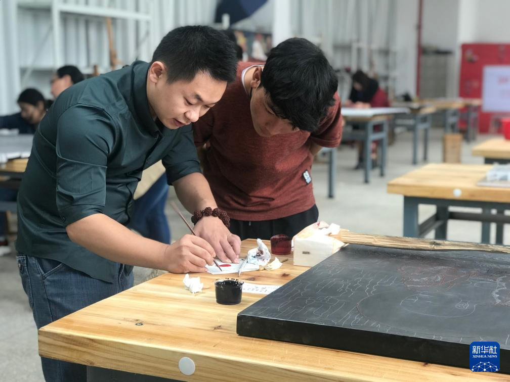 2018年,仁青郎加(右)正跟老師學習漆畫技法。新華社發