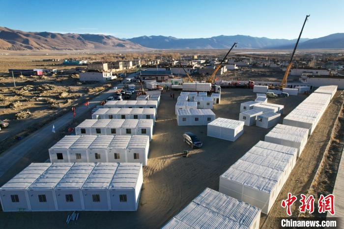 圖為1月10日,西藏定日縣長所鄉(xiāng)森嘎村正搭建移動板房。(無人機畫面)江飛波 攝