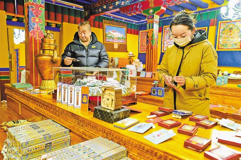 圖為市民在羅布林卡文創精品館選購特色非遺文創產品。記者 丹增群培 攝