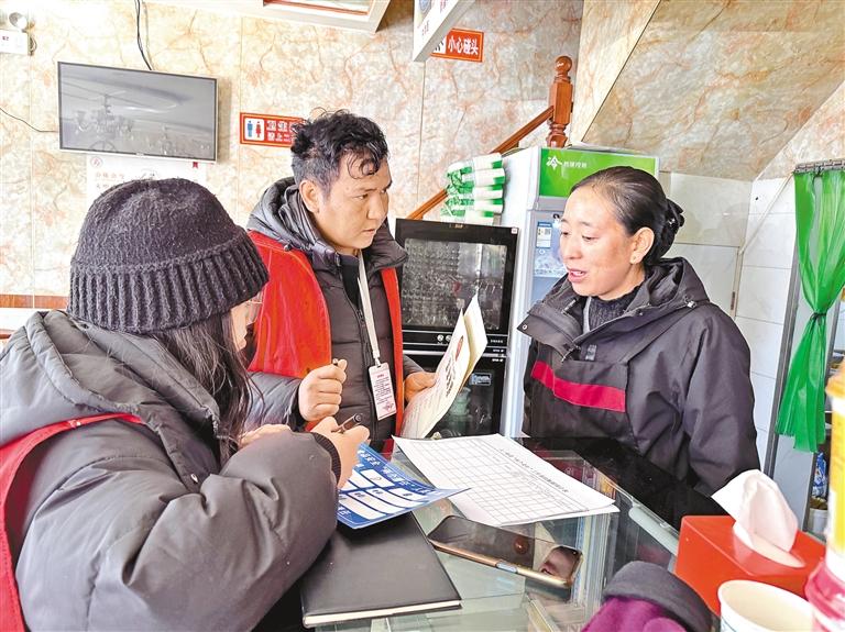 拉薩市城關區八一街道當熱社區組織開展食品安全隱患排查工作。這是工作人員在仔細檢查商戶營業執照、食品衛生許可證和健康證等持證情況。記者 王敏 攝