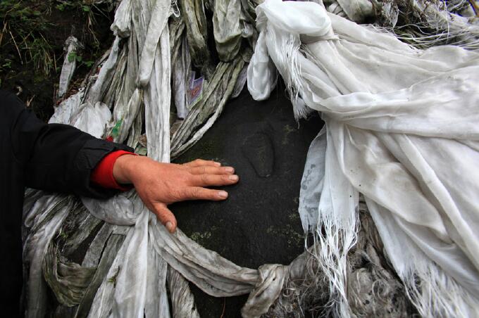 一塊烏黑發亮的石頭,上面有一個赤足印痕,沒有一點兒雕琢痕跡,真像是赤足踏出來的一般,當地人介紹,倉央嘉措曾在肖站附近留下一雙腳印。在腳印周圍,立有大小旗幡,行人過此,都焚香膜拜。(攝影/ 邱衍慶)